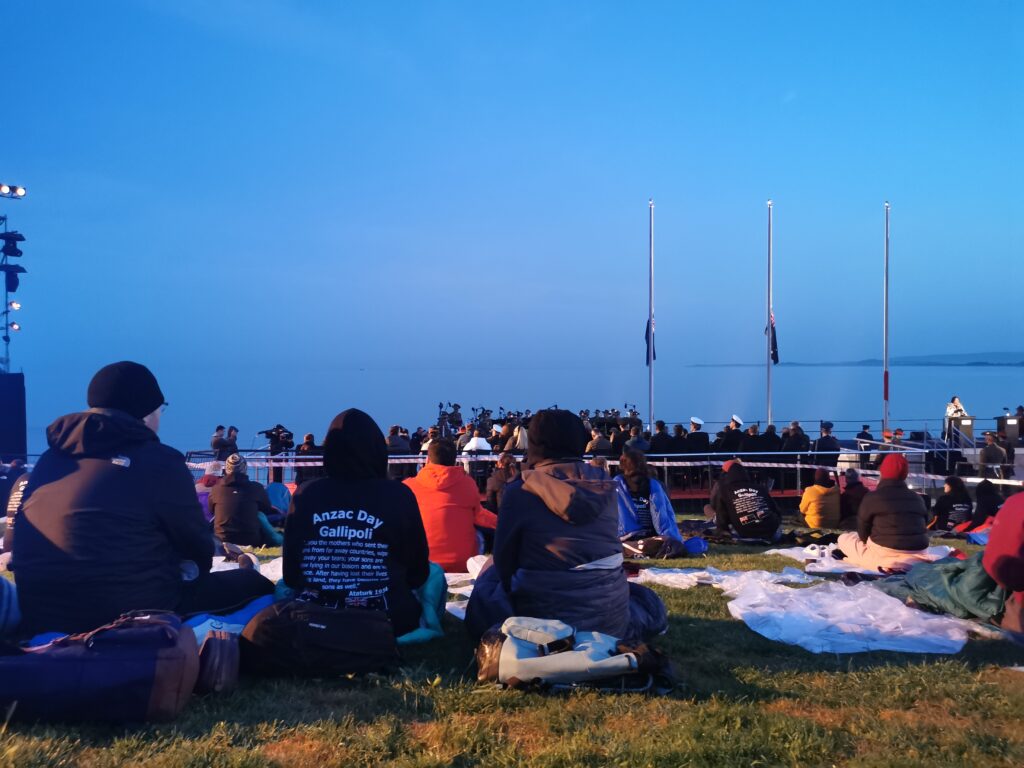 The Dawn Service at Gallipoli began. Readings by defense force members. The Roll of Honour read with portraits of a few who died displayed on screen. The arrival of the Official party. A Karanga and the Playing of a Didgeridoo. Commemorative addresses. The mounting of the Catafalque party. Paryer, hymns, and the Ode of Remebrance. The Last Post rang out across the cove as the hush fell to silence